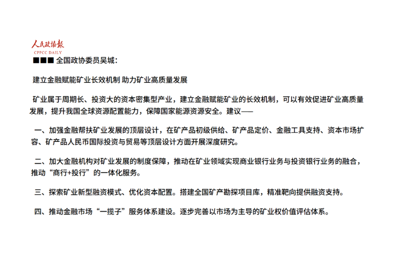 全國政協委員吳城:建立金融賦能礦業(yè)長效機制 助力礦業(yè)高質量發(fā)展