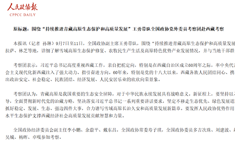 9月7日至11日,全國政協副主席王勇帶隊,圍繞“持續(xù)推進青藏高原生態(tài)保護和高質量發(fā)展”...